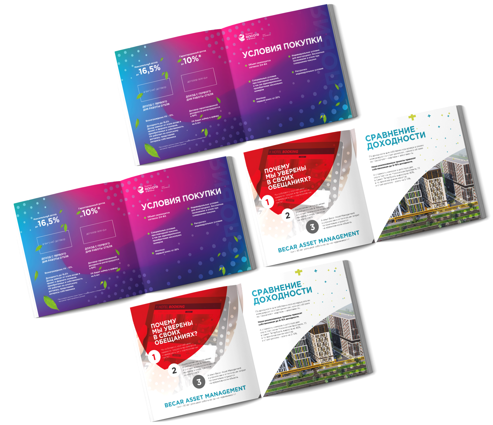 Была разработана динамичная, привлекающая взгляд концепция в фирменных цветах отеля. Сочетание дизайна и хорошо составленного текста помогло наглядно и понятно изложить суть проекта. Благодаря яркому оформлению, брошюра, представленная на выставке, выгодно выделялась на фоне конкурентов.