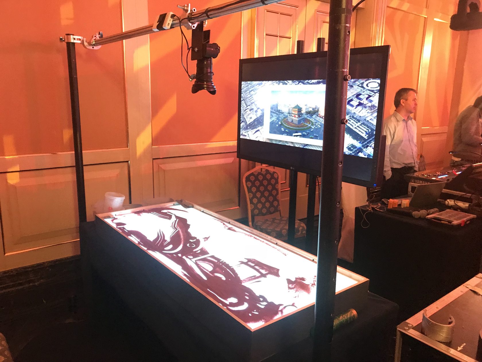 Для поддержки презентации мы произвели специальный стол для рисования песком. Контент подавался в общую презентацию верхним слоем через альфа-канал.